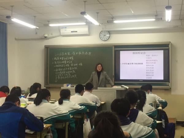 本课首先由学生探讨决策失误之害认识民主决策的重要性,随后石老师用理例结合的方式讲解参与民主决策的渠道,最后以《高中生能否带手机进校园》开展模拟听证会,学生分角色发言,在体验式教学活动中感受民主决策的重要意义,体会民主决策的重要性。