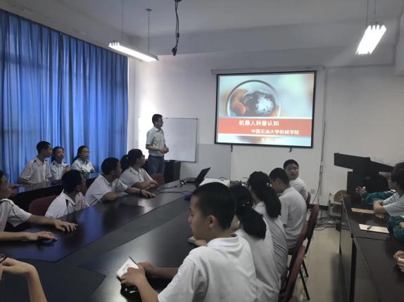 同学们走进石油大学,大家都被校园优美的环境和浓厚的氛围所感染,迈入高等学府的愿望就此在他们心间悄然埋下。同学们首先来到了中国石油大学国家重点实验室多媒体放映室,聆听石油大学的老师讲解关于机器人的讲座。老师围绕什么是机器人,机器人的分类、组成及应用等方面进行深入地讲解。