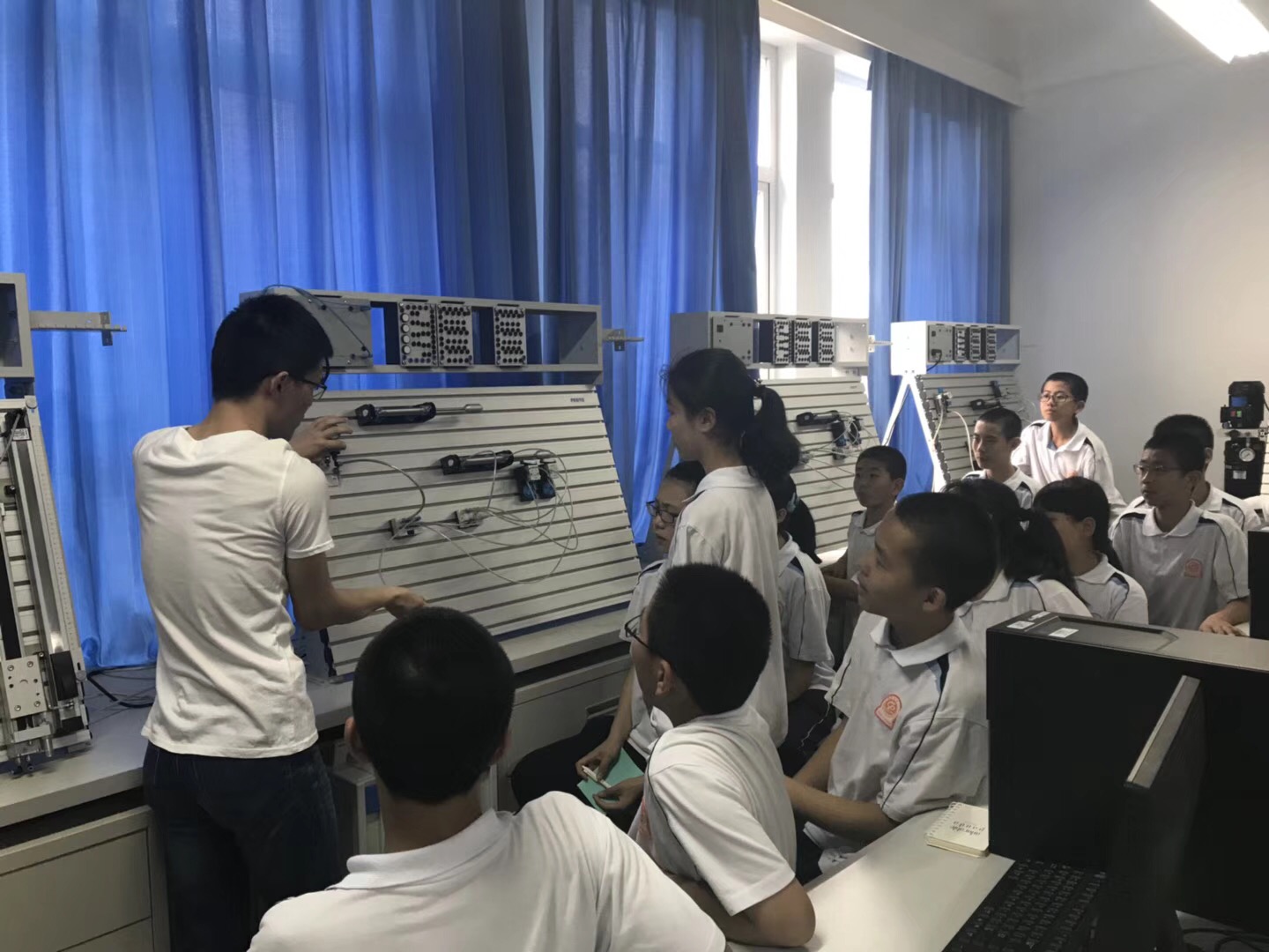 接着,同学们又来到了工程实践实验室,参观创新型工业生产线,了解机器人的驱动方式。接着,同学们来到了机械创新实验室,认知3D打印及激光切割等先进制作设备及创新作品,认识几种大学生机械创新作品及自制机器人。其中一对非常小巧灵活的仿生手臂吸引了同学们,老师就为大家做起了讲解和演示。老师们还着重介绍了我们国家工业机器人的发展情况,由原先的全部进口到现阶段的自主研发,越来越多的国产化设备投入到了工业生产中,同学们由衷地产生了一份自豪感。